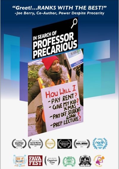 In Search of Professor Precarious is a documentary feature in which the director, a long-time precarious contract instructor, travels Canada to lift the curtain on higher education’s dirty little secret. The search takes viewers into the lives of precarious contract faculty and tells their compelling stories. We also hear from permanent faculty, students, administrators, activists and experts. We see artists in action, experience an outdoor biology class on the shores of Nova Scotia, fight alongside a group of Alberta sessionals trying to make their faculty association more democratic, and watch as the biggest higher education strike in Canadian history unfolds.